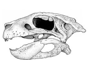The mammoth size of Beelzebufo prompted its discoverers to call it the “frog from hell.” They derived the genus name from the Greek word for devil (Beelzebub) and the Latin word for toad (bufo). The unique bony features of Beelzebufo, are similar to those of a group of frogs known as ceratophryines, which are now found solely in South America. Ceratophryines camouflage themselves in their surroundings and are sit-and-wait ambush predators, lunging out to snatch any unsuspecting prey that happens to wander by.